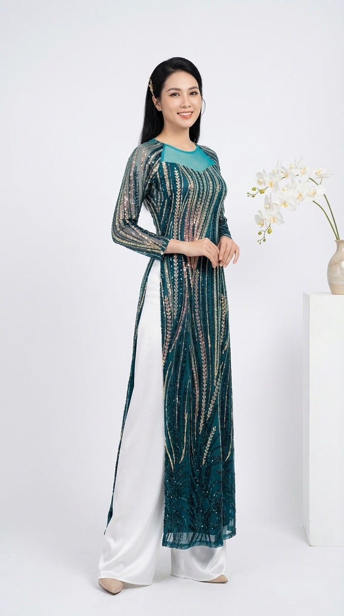 ÁO DÀI BÀ SUI LATIN XANH ĐÍNH KẾT
