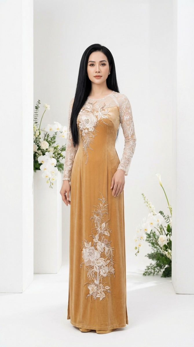 ÁO DÀI BÀ SUI NHUNG DA PHỐI REN