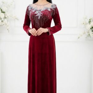 ÁO DÀI BÀ SUI NHUNG ĐỎ CỔ CAO ĐÍNH ĐÁ SANG TRỌNG (NDCT5)