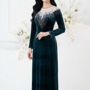 ÁO DÀI BÀ SUI NHUNG XANH ĐÍNH ĐÁ SANG TRỌNG (MS NX32)