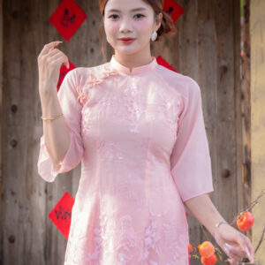 Giá gốc là: 120,000₫.100,000₫Giá hiện tại là: 100,000₫.ÁO DÀI BƯNG QUẢ HỒNG TAY BÈO 5 HOA NHỎ