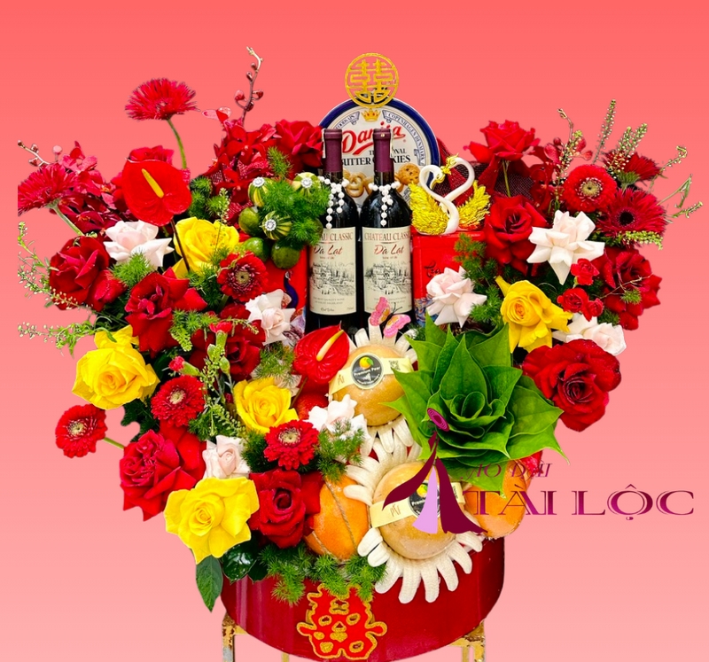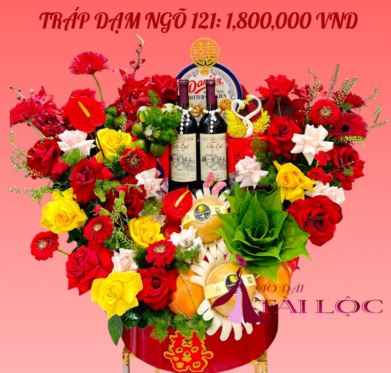 Tráp dạm ngõ 121: 1,800,000 VND 1 bánh danisa 454 + 1 cặp vang đà lạt + 1 cặp trà olong lon thiết + 2 trái cam úc + 4 trái táo gala + 2 lê hàn + 10 TRÁI CAU + HOA TRẦU, KẾT BÔNG. LƯU Ý: KHÁCH HÀNG PHẢI CỌC 300,000 ĐỂ THẾ CHÂN QUẢ TRỐNG. KHI TRẢ LẠI QUẢ SHOP SẼ GỬI LẠI CỌC THẾ CHÂN CHO KHÁCH + MIỄN PHÍ SHIP 10KM