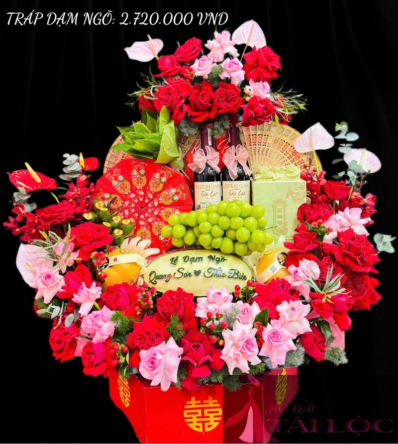 Tráp Dạm Ngõ 94: 2.720.000 VND (12 BÁNH CỐM BẢO MINH, CẶP RƯỢU VANG ĐÀ LẠT, 1 LON TRÀ Ô LONG ẤN RỒNG XANH, 1 TRÁI DƯA KHẮC, 2 TRÁI LÊ HÀN, 1 CHÙM NHO XANH, 10 CAU+1 BÔNG TRẦU, KẾT HOA 2 TỤ + MIỄN SHIP 10KM. LƯU Ý: KHÁCH HÀNG PHẢI CỌC 300,000 ĐỂ THẾ CHÂN QUẢ TRỐNG. KHI TRẢ LẠI QUẢ SHOP SẼ GỬI LẠI CỌC THẾ CHÂN CHO KHÁCH +MIỄN PHÍ SHIP 10KM)