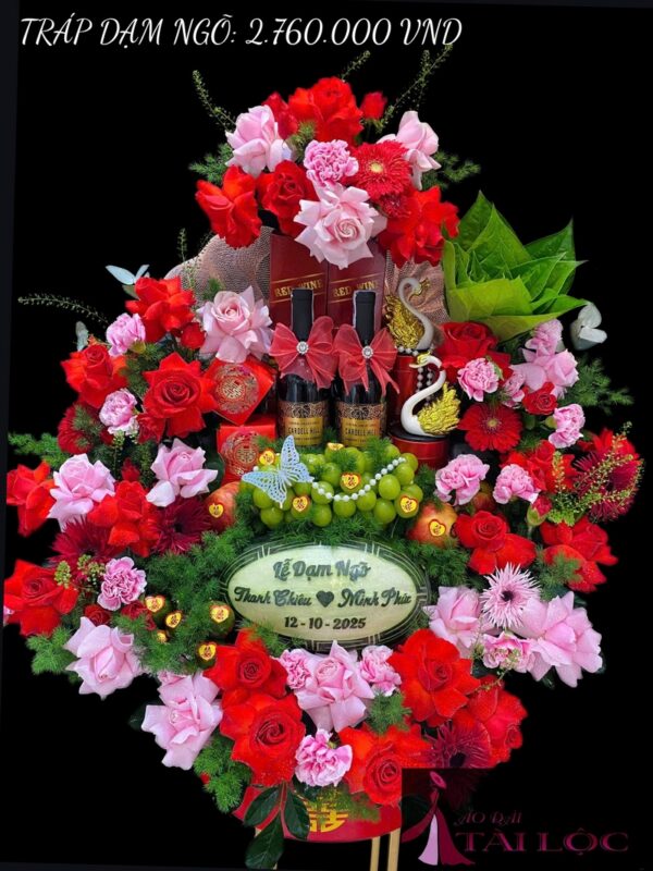 Tráp Dạm Ngõ 96: 2.760.000 VND (CẶP RƯỢU VANG CHILE, CẶP TRÀ Ô LONG, 6 BÁNH CỐM BẢO MINH, 1KG TÁO ĐỎ, 1 CHÙM NHO XANH, 1 TRÁI DƯA KHẮC TÊN, 10 CAU + HOA TRẦU, KẾT HOA + MIỄN SHIP 10KM. LƯU Ý: KHÁCH HÀNG PHẢI CỌC 300,000 ĐỂ THẾ CHÂN QUẢ TRỐNG. KHI TRẢ LẠI QUẢ SHOP SẼ GỬI LẠI CỌC THẾ CHÂN CHO KHÁCH + MIỄN PHÍ SHIP 10KM)