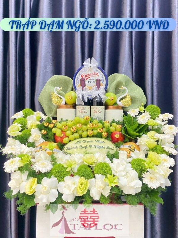Tráp Dạm Ngõ 98: 2.590.000 VND (2 TRÁI TÁO XANH, 2 TRÁI TÁO ĐỎ, 2 TRÁI LÊ HÀN, 1 TRÁI DƯA KHẮC TÊN, 1 CẶP RƯỢU VANG ĐÀ LẠT, 1 CẶP TRÀ Ô LONG, 1 DANISA 110GR, 10 CAU + HOA TRẦU, KẾT HOA + MIỄN SHIP 10KM. LƯU Ý: KHÁCH HÀNG PHẢI CỌC 300,000 ĐỂ THẾ CHÂN QUẢ TRỐNG. KHI TRẢ LẠI QUẢ SHOP SẼ GỬI LẠI CỌC THẾ CHÂN CHO KHÁCH + MIỄN PHÍ SHIP 10KM)
