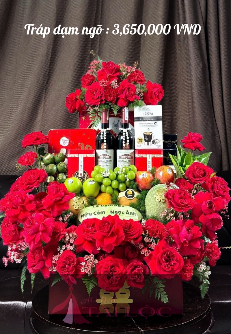 TRÁP DẠM NGÕ 106: 3,650,000 VND (CẶP RƯỢU VANG ĐÀ LẠT, CẶP TRÀ OLONG LON THIẾC, DƯA KHẮC, 1 TRÁI DƯA LƯỚI, 2 TRÁI LÊ HÀN, 1 TRÁI CAM ÚC, 2 TRÁI TÁO XANH, 2 TRÁI TÁO ĐỎ, 1KG NHO XANH + HỘP CAFE TRUNG NGUYÊN LEGEND + 2 GÓI THUỐC BA SỐ ANH, HỘP BÁNH LU ĐỎ 310GR, HỘP BÁNH DANISA ĐỎ 405GR, 10 TRÁI CAU, BÔNG TRẦU, KẾT HOA TƯƠI 2 TỤ. LƯU Ý: KHÁCH HÀNG PHẢI CỌC 300,000 ĐỂ THẾ CHÂN QUẢ TRỐNG. KHI TRẢ LẠI QUẢ SHOP SẼ GỬI LẠI CỌC THẾ CHÂN CHO KHÁCH + MIỄN PHÍ SHIP 10KM)