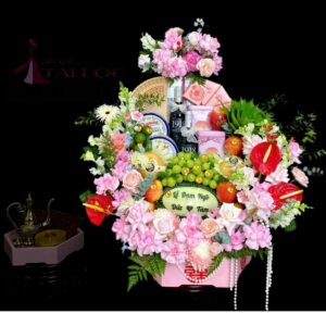 TRÁP DẠM NGÕ 25 : 3.450.000 VND (2 táo envy+lê hàn 2 trái+kiwi 2 trái+chery 4 lạng+1 cặp trà olong+1 cặp rượu Vang PHÁP+2 dưa lưới+10 trầu cau+1cặp bánh danisa nhỏ Kết bông 2 tụ , MIỄN SHIP 10KM )