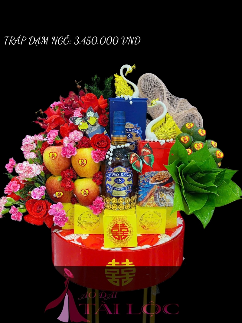 Tráp Dạm Ngõ 95: 3.450.000 VND (10 BÁNH CỐM BẢO MINH, 1 CHAI CHIVAS18, 4 TRÁI TÁO ĐỎ THƯỜNG, 1 LON TRÀ Ô LONG, 1 GÓI 3 SỐ VIỆT, 10 CAU + HOA TRẦU, KẾT HOA + MIỄN SHIP 10KM. LƯU Ý: KHÁCH HÀNG PHẢI CỌC 300,000 ĐỂ THẾ CHÂN QUẢ TRỐNG. KHI TRẢ LẠI QUẢ SHOP SẼ GỬI LẠI CỌC THẾ CHÂN CHO KHÁCH +MIỄN PHÍ SHIP 10KM)