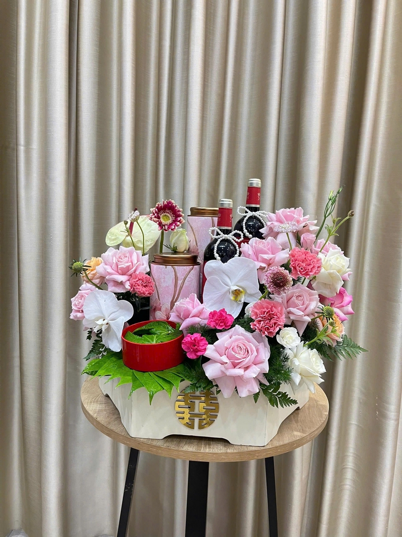 4. MÂM 2 CẶP TRÀ Ô LONG + CẶP RƯỢU VANG ĐÀ LẠT + KẾT BÔNG 1 TỤ