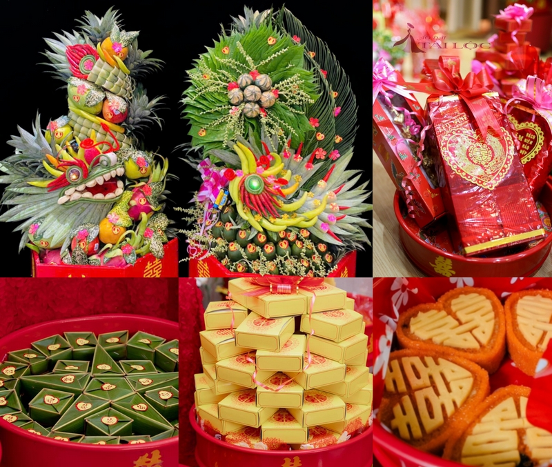 2.Trước ngày làm lễ bên Tài Lộc sẽ giao quả đến tận nhà trước nhưng mâm đồ khô như : –Trầu cau, trái cây, rồng phụng ,bánh phu thê,bánh pía, trà rượu , đèn…